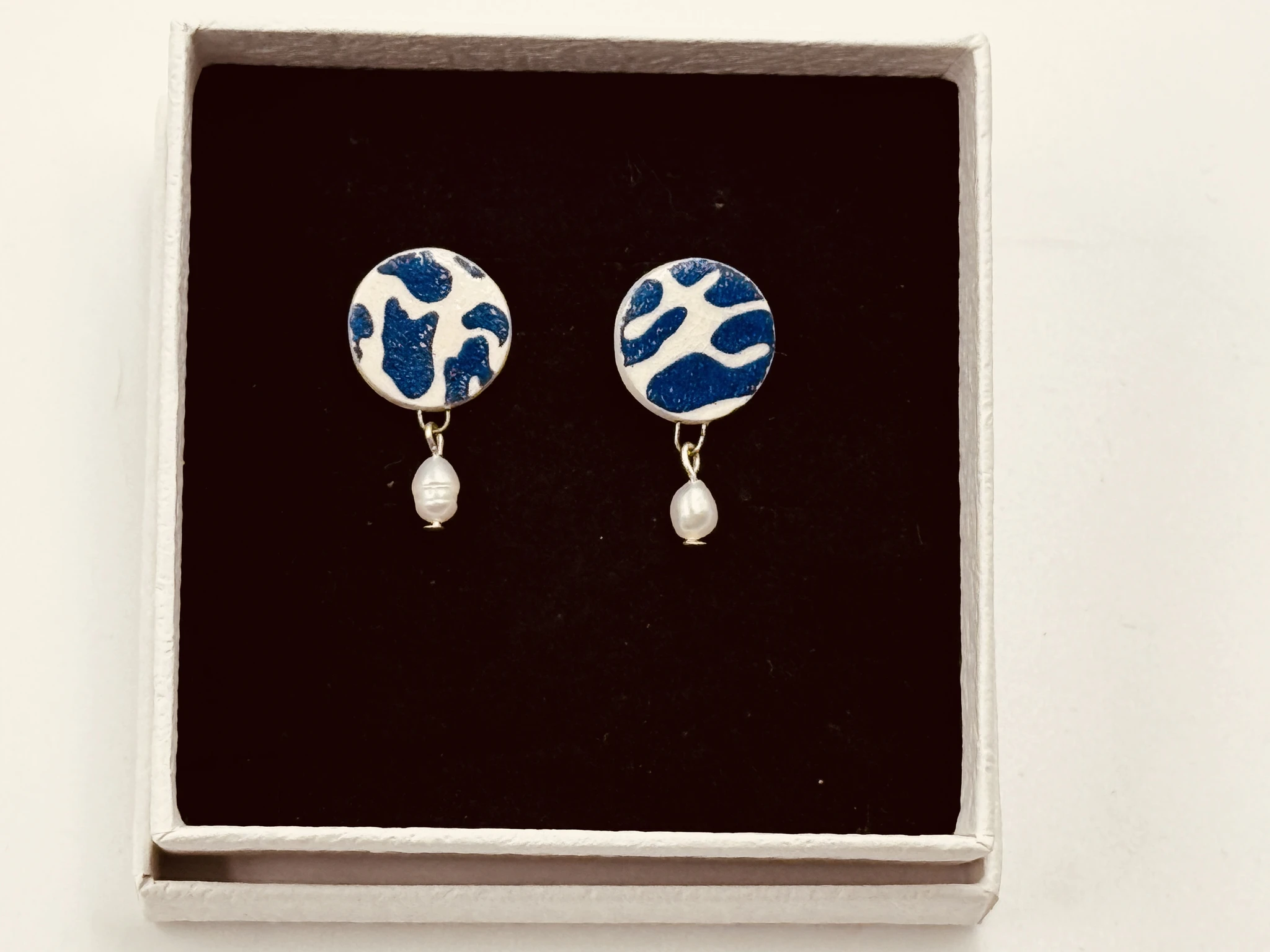 Kõrvarõngaste medaljonid on valmistatud portselanist, tagused on hõbedast, rippumas mageveepärl.