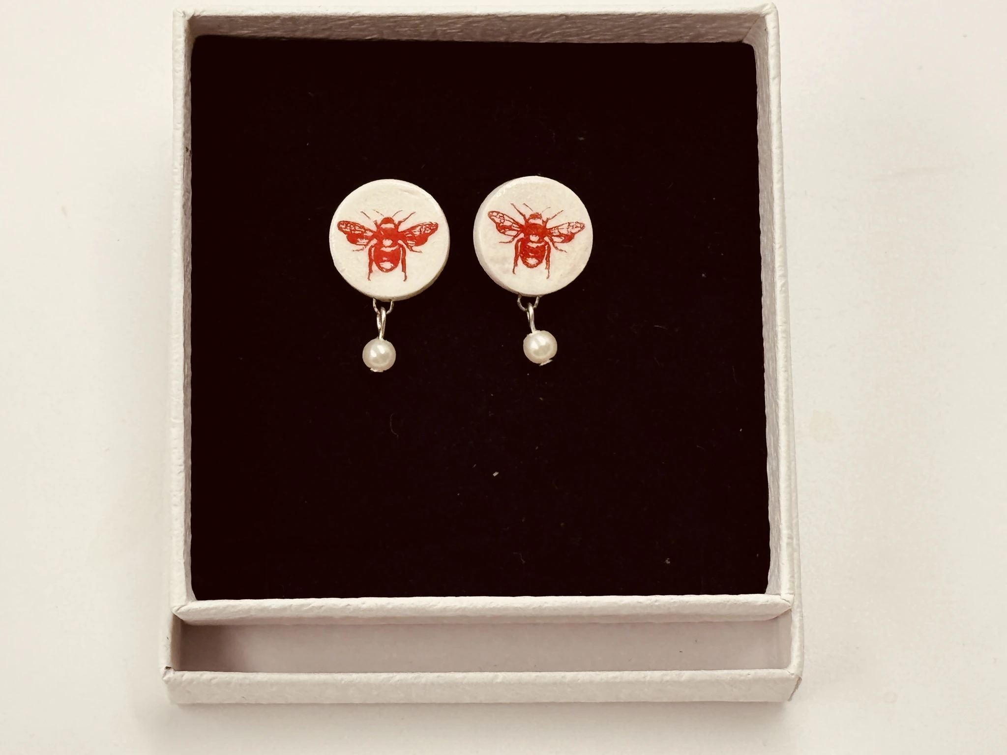 Kõrvarõngaste medaljonid on valmistatud portselanist, tagused on hõbedast, rippumas pärl.