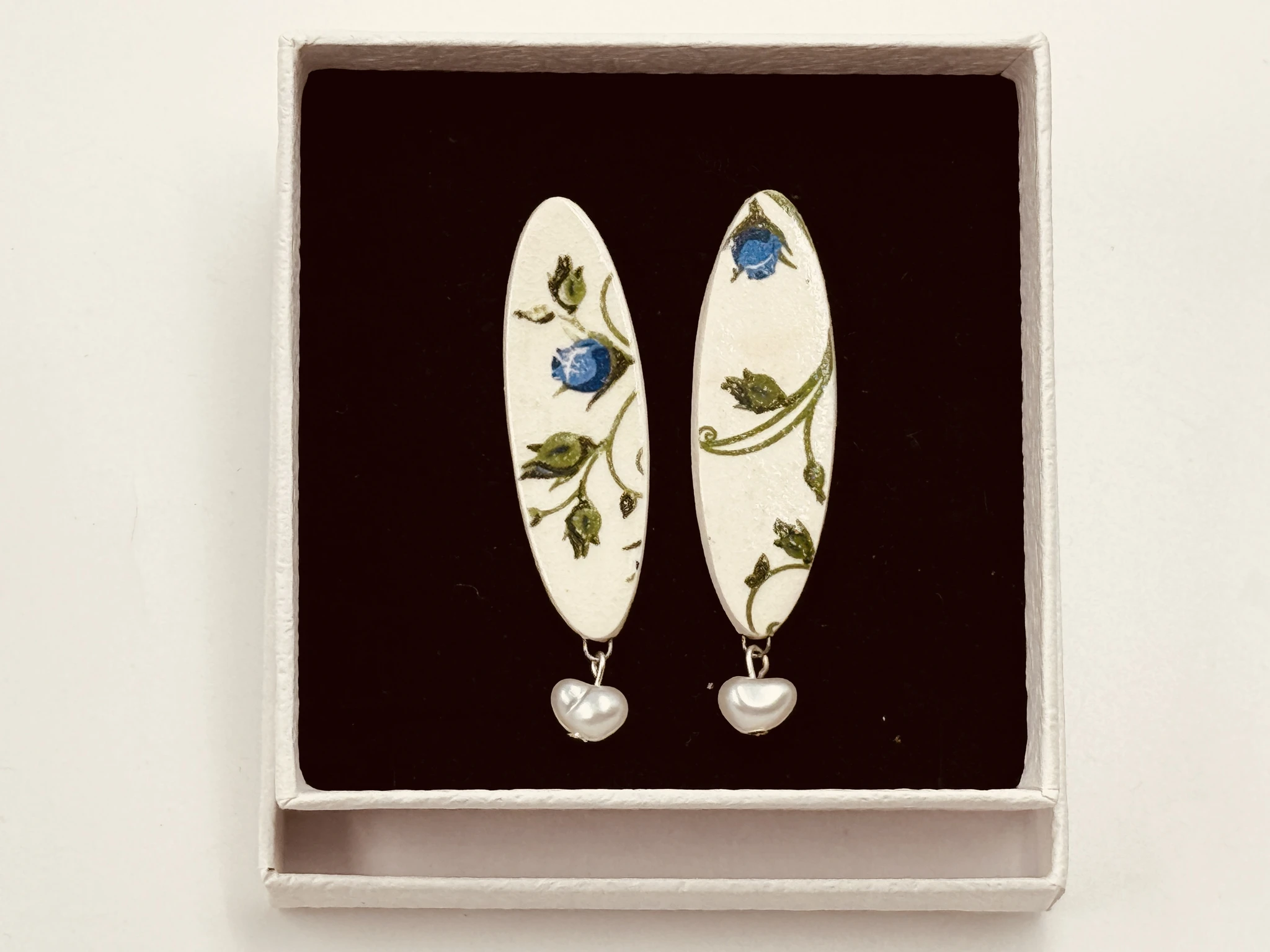 Kõrvarõngaste medaljonid on valmistatud portselanist, tagused on hõbedast.